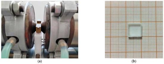 Thanks to DSC analysis, the most optimal conditions for cross-linking of the liquid crystalline epoxy composition LCEM/1,3-PDA were established. Samples of the mixtures were placed in Teflon molds (7 mm × 3 mm × 7 mm) and cured under the conditions specified in Table 1. Isothermal conditions were determined based on the temperatures at which the cross-linking process begins. The isothermal analyses conducted at specific temperatures are presented in Section 3.1.2. The samples were cured in a magnetic field using an RTM-1 device from REMEL S.C., Nowy Targ, Poland, equipped with neodymium magnets capable of providing a homogeneous magnetic field of induction up to 1.2 T (Figure 3).