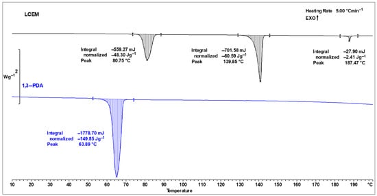 During DSC analysis of the individual components of the mixture, the peaks characteristic of the liquid crystalline monomer and the aromatic diamine were recorded. The course of the DSC thermal curve obtained for the LCEM resin during the first measurement cycle (Figure 4, black line) suggests that the compound undergoes three endothermic transformations during heating. The first peak was observed at 81 °C and is a response to the polymorphic transformation of the compound. It indicates the moment when the LCEM monomer starts to have a different crystal structure. The next transition was recorded at about 140 °C when LCEM became a nematic liquid crystal. The last peak with the minimum at 187 °C shows the beginning of isotropization. During the heating of 1,3-phenylenediamine, the endothermic transformation above 64 °C was recorded in the thermogram (Figure 4, blue line), which was associated with the melting of this compound. All minimums appear at temperatures close to those given in the literature [13,21]. Table 2 summarizes the phase transformation parameters determined for both the monomer LCEM and 1,3-PDA amines.