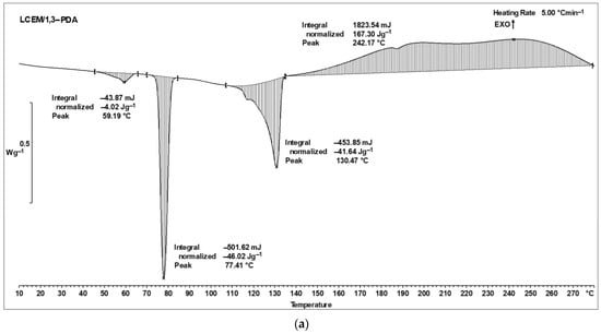 The DSC analysis for the composition of LCEM/1,3-PDA (Figure 5a) showed interesting changes in the peaks appearing in the thermogram compared to the results that occurred for single compounds (Figure 4). It can be seen that the peak for the melting of aromatic diamine, which is close to 64 °C, is visible in the composition thermogram around 59 °C. This change may be induced by overlapping signals from 1,3-PDA and LCEM. The peak representing the polymorphic transformation of the liquid crystal monomer at 80 °C (Figure 4) is observed to occur at a slightly lower temperature in the case of the composition’s thermogram (around 77 °C). A similar situation appears for the liquid crystalline monomer, where the minimum peak for the monomer itself is assigned to a higher temperature (around 140 °C) than in the composite with a diamine (around 130 °C). The mixture begins to cross-link clearly around 150 °C and takes place with the release of energy. This results in a long exothermic peak that lasts until the end of the analysis.