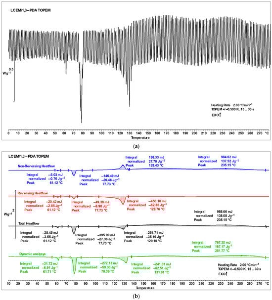DSC-TOPEM® curve of the LCEM/1,3-PDA: (a) before mathematical processing and (b) after mathematical processing.