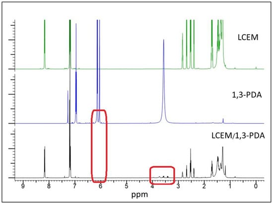 1H-NMR spectra of pure components before heating, and the LCEM/1,3-PDA mixture after heating to 134 °C. The red frame indicates the location where the signals for individual components of the mixture disappear.