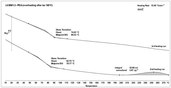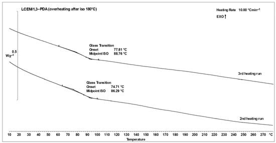 Samples of the LCEM/1,3-PDA composition of LCEM/1,3-PDA analyzed at higher temperatures (180 °C, 190 °C, and 200 °C) for 3 h were completely cross-linked during isothermal analysis. During their overheating, no increase in the curves was recorded. The glass transition temperatures are very close to each other, which also proves complete the cross-linking of the sample. Figure 9 shows the results of overheating for the sample analyzed at 180 °C for 3 h. Similar results were obtained for two-stage cross-linked samples.