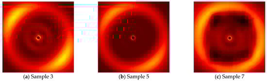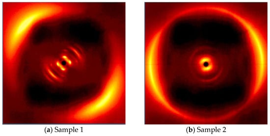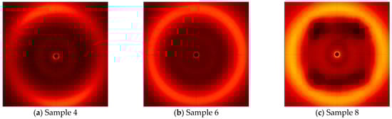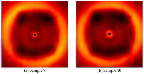 Figure 12 shows samples cross-linked at analogous temperatures but without the presence of a magnetic field. In the case of Sample 4 (Figure 12a), a subtle thickening appears on the ring, similar to the sample cured at 160 °C, which means that the mesogens are partially ordered, even without the presence of a magnetic field. For Samples 6 (Figure 12b) and 8 (Figure 12c), there is no visible ordering according to the X-ray analysis.