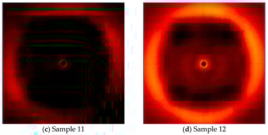 Due to the interesting results obtained for Samples 1 and 2, it was decided to also test the samples cross-linked in two steps. This process consisted of keeping the sample at a constant temperature of 160 °C or 170 °C for 180 min and then increasing the temperature to 200 °C for 60 min. Similarly to the previous measurements, curing took place in the presence (Samples 9 and 11) and without the presence of a magnetic field (Samples 10 and 12). However, none of the samples examined during the X-ray analysis showed order in the structure (Figure 13).