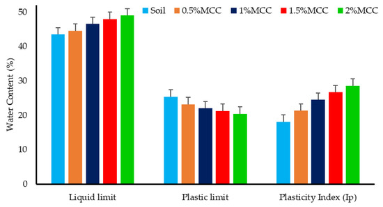 The PI of kaolin was 16.4%, while the PI of the soil–MCC mix with the maximum investigated MCC dosage of 2% was 28.5%, i.e., a nearly 74% increase was observed. The significant increase in PI indicates that the addition of MCC increases the plastic nature of the soil, and this can be attributed to the hydrophilic nature of MCC.