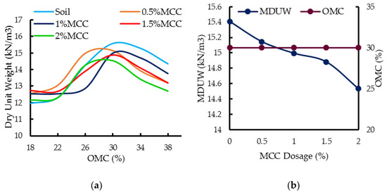 (a) Effect of MCC on compaction curves. (b) Effect of MCC on MDUW and OMC.