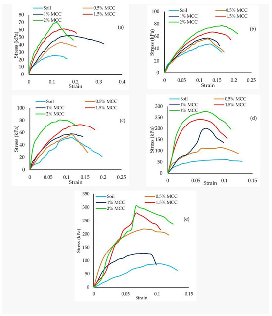 Stress–strain response of MCC-treated soil. (a) 1 day, (b) 7 day, (c) 28 day, (d) 56 day and (e) 90 day.