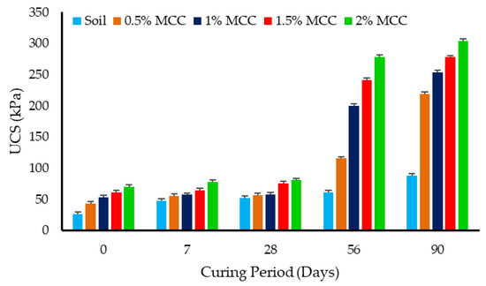 The UCS increased with an increase in dosage and aging in MCC-treated soil specimens, as observed in Figure 8. The percentage variation between the investigated samples to determine the UCS at each dosage and curing period was limited to 3%. At the 1-day curing period, the UCC of kaolin was 26 kPa, while that of kaolin treated with 2% MCC was nearly 70 kPa, recording an increase of approximately 2.69 times the strength of untreated kaolin. The highest rate of increase was observed at a 0.5% MCC dosage, where the UCS increased by 1.66 times, and then with the further addition of MCC in dosages of a 0.5% increment, gradually increased to 70 kPa. Also, with aging, there was a gradual and marginal increase in strength for all investigated dosages up to a curing period of 28 days, but at the longer curing period of 56 and 90 days, there was a marked increase in strength. There was an approximate increase of 1.15 times in the UCS of 2% MCC-treated kaolin at the end of the 28-day curing period, while the UCS markedly increased by 4.34 times at the end of the 90-day curing period compared with the UCS at the 1-day curing period. Also, it can be observed that the rate of increase in the UCS between the 56- and 90-day curing periods was 1.09 times, while that between the 28- and 56-day curing period was 3.45 times, indicating that despite the increase in strength, the rate of increase diminished with further time.