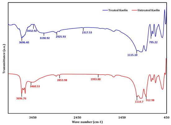 FTIR spectrum for koalin and MCC-treated kaolin.