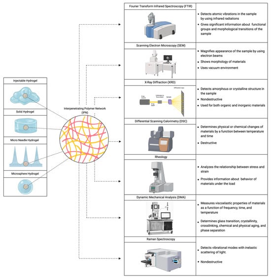 Chemical, physical, and mechanical characterization methods have been conducted to understand the structure of the material and investigate whether it is an IPN or not. The most common characterization methods discussed in the literature are Fourier transform infrared spectroscopy, Raman spectroscopy, scanning electron microscopy, field emission scanning electron microscopy, differential scanning calorimetry, X-ray diffraction, dynamic mechanical analysis, and rheology [,]. Researchers use one or more characterization methods to assess the IPN structure of their material. However, these methods have not been brought together and explained in one paper (Figure 4).