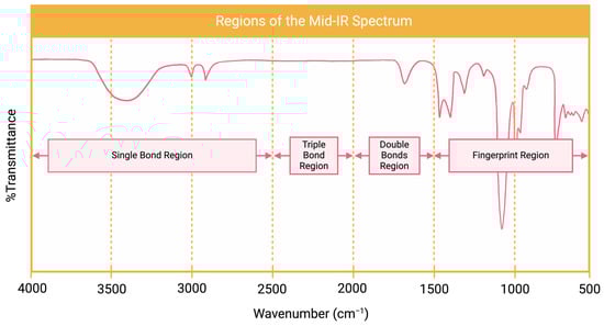 Fourier transform infrared spectroscopy (FTIR) is used for the characterization of different kinds of materials by infrared radiation (IR). This method is an effective approach for materials/samples that can be present at solid, liquid, gas, film, fiber, and powder forms. It detects molecules’ atomic vibrations in the sample by using IR. FTIR is used in different applications such as drug and medical device development, food analysis, polymer science, industry, and academic research. It provides information about the chemical structure of molecules, functional groups and chemical bonding and chemistry identification/characterization of the sample []. Results from the FTIR analysis are understood by reading the FTIR spectrum. This spectrum shows “absorption values versus wavenumbers” or “transmission values versus wavenumbers”. To understand this spectrum, it is necessary to know in which region the analysis is performed. The infrared spectrum is separated into three main regions. These regions are the far-IR spectrum (<400 cm−1), mid-IR spectrum (400–4000 cm−1), and near-IR spectrum (4000–13,000 cm−1). The mid-IR spectrum is used mostly for the samples. Figure 5 shows a general view of a mid-IR spectrum.