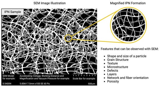 SEM is a nondestructive method that can detect a broad range of materials such as polymers, metals, ceramics, biological samples, and more within a vacuum environment [,,,,]. SEM is an important method to determine IPN formation because it shows the arrangements, defects, voids, and structure of the material [] (Figure 6). Therefore, the IPN structure can be observed and interpreted by using SEM, and these results might be used to prove whether or not an IPN has formed.