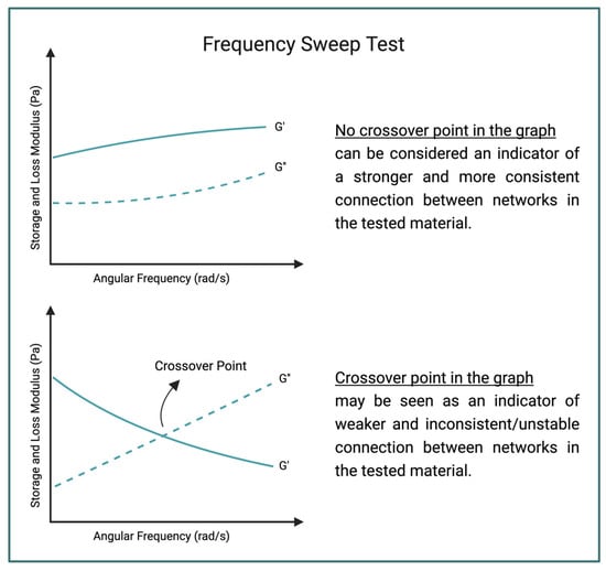 Rheology is a term used for understanding viscoelastic behavior of a material. It analyses the relationship between stress (force) and strain (deformation) when a load is applied []. Examining hydrogels with rheology provides information about their behaviors under a load. Hydrogels can be shown as a complex system due to their liquid- and solid-like behaviors. For example, hydrogels used as injectable drug delivery devices display a shear thinning response and their structure can change with these applications. Therefore, it is important to understand the behaviors of injectable hydrogels for in vivo and clinical studies []. A rheometer is used to measure the mechanical behaviors of materials, and one of the tests which determine mechanical behavior is the frequency sweep test []. Figure 8 shows a generalized illustration of two different frequency sweep test graphs. According to Stojkov et al., crossover point is an indicator of consistent connections in a hydrogel []. These rheology tests may help determine IPN structure within a hydrogel [,]. Examples of using rheology to characterize IPN hydrogels will be covered in the next section.