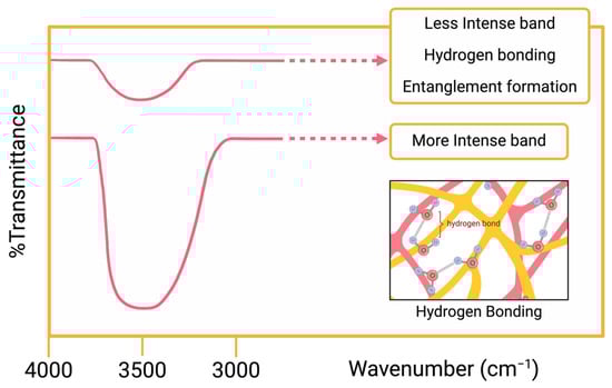 Agnihotri et al. synthesized a novel hydrogel to use in controlled drug delivery. The aims of this study were (i) sustaining a stable blood level, (ii) reducing negative effects of drugs, and (iii) increasing the drug efficacy. To achieve their goals, they formed an IPN microsphere hydrogel from gellan gum (GG) and poly(vinyl alcohol) (PVA) via emulsion crosslinking method. Carvedilol, which is a hypertension treatment drug, was loaded to the microspheres to understand drug release kinetics and glutaraldehyde (GA) crosslinker was used for different crosslinking levels. FTIR, DSC and tensile strength measurements were used to observe interpenetrating network of the microspheres. In the FTIR interpretations, it was observed that GG’s broad band at 3444 cm−1 and PVA’s broad band at 3425 cm−1. Unloaded GG-PVA microspheres showed their broad band at 3487 cm−1. Their values were similar; however, the intensities of the bands showed differences. Figure 9 shows a similar illustration of the intensities of the bands at the hydrogen bond region. Unloaded GG-PVA microspheres had less intensity in contrast to GG and PVA. It was determined that these data were observed because uncrosslinked hydroxyl groups of the glucopyranose ring bonded with hydrogen and created hydrogen bonding []. As mentioned at the beginning of this article, physical crosslinking occurs to form IPNs in materials. According to Agnihotri et al., this finding confirms the IPN structure of the microspheres.