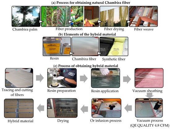 Method of manufacture of the hybrid material. In part (a) there is the process to obtain the natural Chambira fiber, in (b) the components of the hybrid material are presented and in (c) there is the forming process of the hybrid material of epoxy matrix reinforced with synthetic and natural fibers.
