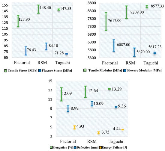 When comparing the modified DOE models in the optimization process, which generate a better prediction R2 value, it is found that when analyzing individually the material properties, the RSM model obtains higher values in tensile and flexural stress and deflection; while the factorial model optimizes better the flexural modulus and failure energy; and the Taguchi model is higher in tensile modulus and elongation, as can be seen in graph 2. With respect to multiple optimization, the model that best maximizes and combines the seven mechanical properties of the composite material, is the factorial design modified by its value of the composite desirability function, since this parameter is of utmost importance to establish the quality of a prediction model as indicated by the authors Costa, Lourenco and Pereira [65], which in the present research is 0.7537 for the factorial design and is higher than the RSM of 0.7483, whose values are acceptable in relation to the research carried out by Lee, Jeong and Kim [66]. In addition, it is also found that the adjusted coefficient of determination R2 and prediction R2 of the factorial model is higher for each of the response variables in relation with the other two models analyzed.