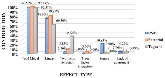 For the three DOE analysis models, the contribution of their source elements is significant, since the ANOVA of the data generated by the composite desirability function has a p_value of less than 0.05. In relation to the percentage contribution of the effects globally, the most adequate model is the factorial with 99.73% which can be observed in Figure 3, that is to say that its error is 0.27% which is less than 5%, which is good in comparison with the research carried out by Baeza et al. [67] in composite materials with natural fiber in relation to the desirability function, it should be mentioned that the RSM and Taguchi models also have an error of less than 5%. With respect to the effects that have the greatest influence on the DOE models are the linear and linear iterations with two factors, as well as the quadratic effect influences the RSM.