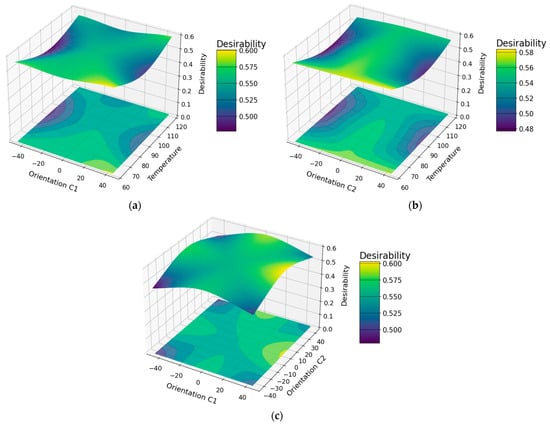 Surface and contour plots of the modified factorial model. (a) C1 fiber orientation, temperature and desirability, (b) C2 fiber orientation, temperature and desirability, and (c) C1, C2 fiber orientation and desirability.