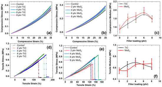 (a,b) Compressive stress–strain curves of TiC and MoS2 composites; (c) compressive moduli of TiC and MoS2 composites; (d,e) tensile stress–strain of TiC and MoS2 composites; (f) tensile moduli of TiC and MoS2 composites.