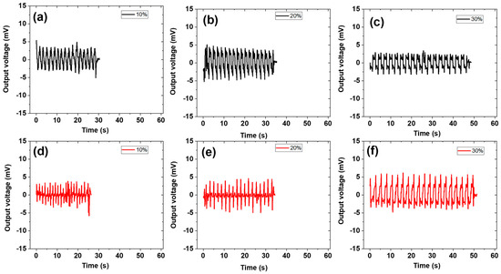 With the above points in mind, Figure 3a–c present the behavior of the output voltage under increasing compressive cyclic strain from 10% to 30% for the 6 phr TiC. The results show that the output voltage was higher for higher compressive loads up to 20% strain and then decreases at 30% and above. This electromechanical behavior of TiC was slightly different from that of the compressive loads in Figure 2. This difference is proposed to be due to the electrical response, which causes the output voltage to be different from the mechanical behavior [50]. This electrical response is optimum at 20% compressive strain. The testing also involves applying repeated compressive loads to measure changes in the mechanical and electrical properties over time. Thus, both electrical and mechanical stability are important for electromechanical tests. Therefore, understanding the electromechanical properties under compressive cyclic loading is crucial in designing and maintaining reliable electromechanical devices [51,52].