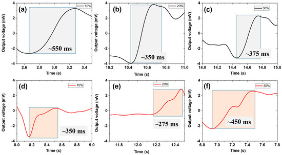 Among them, the type of mechanical response refers to the immediate, reversible deformation to external stimuli. Moreover, filled rubber composites generally exhibit viscoelastic behavior [58]. This behavior results from time-dependent deformation that includes both elastic and viscous components, leading to hysteresis and energy dissipation. However, the response rate studied in this work is related to electromechanical features, i.e., the influence of the output voltage against external stimuli [59]. Therefore, Figure 4a–c show the response times of composites filled with 6 phr of TiC under increasing strain of 10–30%. The results agree with the electromechanical results in Figure 3. For example, the response time was shortest at 20% compressive strain, as expected. This feature is proposed to be due to the optimum packing fraction of the filler particles at this strain [42]. These values further show that our results are consistent with each other. The mechanism behind these electromechanical responses refers to the generation of an electric charge in response to mechanical deformation [59]. Moreover, the process also involves the ability of the composite material to store or dissipate electrical energy in the form of an output voltage. Various factors affect the response time, and the type of filler is one of the most crucial factors [60]. The material type is well known to alter the response time by changing the composite’s mechanical and electrical properties.