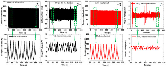 Mechanical and electromechanical stability at 30% compressive cyclic strain for (a,b) TiC-based composites; (c,d) MoS2-based composites.