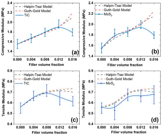 Here, “E” is the predicted modulus of the composite, “Eo” is the modulus of the control sample, “f” is the aspect ratio of the filler, and “ϕ” is the volume fraction of the composite. The results presented in Figure 7a,b show that the models agree well with the literature up to 6 phr and then deviate from the experimental values. This deviation could be due to the partial aggregation of the filler particles in the experimental data. Due to aggregation, the properties fall after 6 phr loading for both the TiC- and MoS2-filled composites. Several factors influence accurate modulus prediction. These are filler dispersion, the filler morphology, the properties of the rubber matrix, the volume fraction of the fillers, and interfacial bonding [77]. Among them, the filler properties include the modulus, shape, size, and aspect ratio of the filler considered. Similarly, Figure 7c,d show that the model agrees well up to 6 phr for TiC and 8 phr for the MoS2-filled composites. The results indicate that the experimental data are influenced by uniform filler dispersion up to 6 phr for TiC and then slight aggregation occurs at 8 phr for the TiC-filled composite. Moreover, the MoS2-filled composites show fair agreement with the predicted models until 8 phr loading. However, the model assumes uniform filler dispersion and perfect interfacial bonding.