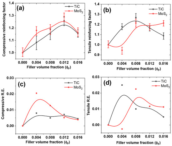 (a,b) Reinforcing factors of the composites; (c,d) reinforcing efficiency of the composites.