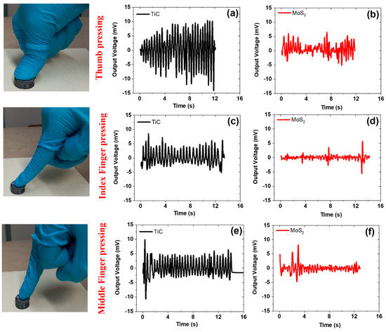 (4) Real-time monitoring reveals the biomechanical properties. The tests show that the output voltage is the highest for thumb pressing. For example, thumb pressing results in an output voltage of ~10 mV at 6 phr of TiC and 5.6 mV at 6 phr of MoS2.