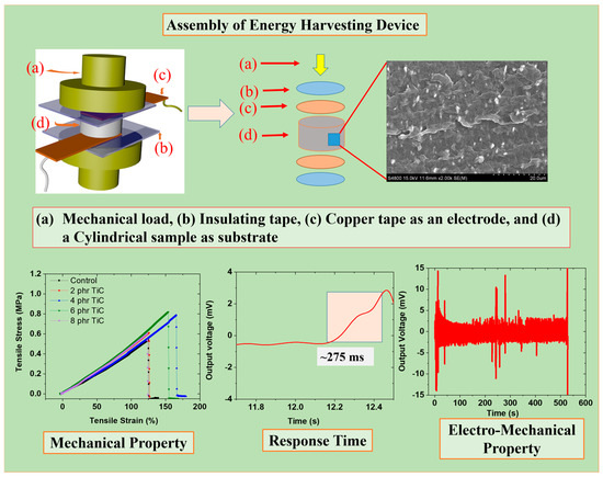 Achieving mechanical and electromechanical stability is critical in terms of using the composites in sensors and energy harvesting applications. Such tests help to assess how these rubber composite materials respond to mechanical forces, electrical inputs, and environmental changes over time [63]. These tests ensure that these composite materials can withstand mechanical stresses and strains without failure. These tests are also useful for safety and reliability in various applications, like structural integrity for automotives and as a source of energy harvesting [64]. Moreover, stability tests ensure the consistent performance of these composites under mechanical stress and electrical inputs for crucial precision applications. Most importantly, stability tests ensure the reliability of energy production due to these composites’ high dielectric and piezoelectric properties [65].