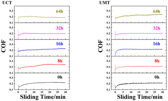 Figure 4 shows the changing trend of COFs vs. aging time as UHMWPE matrix composites coupled with a GCr15 bearing steel ball. The COFs initially decreased from 0 h to 16/32 h and then increased slightly with an increasing aging time of up to 64 h. Overall, all four composites exhibited excellent lubricating properties and the variation range was 0.19–0.23. For UMT and UCT composites, the COFs increased slightly with an increasing aging time from 0 to 8 h while these values reached the lowest value of 0.2 and 0.19 with increasing aging times of up to 32 and 64 h, respectively. For UCMT5 and UCMT10 composites, the fluctuation for COFs was slightly different: from 0 h to 32 h, the COFs gradually decreased and reached the lowest value of 0.19 at 32 h. With an increasing aging time up to 64 h, the COF increased continuously to the highest value of 0.22. This phenomenon can be explained through the following aspects: as the aging time increases from 0 h to 16/32 h, oxidative film formed on the worn surface is quickly removed and the fresh layer is exposed, so the COFs of these composites decrease while, as the aging time increases to 64 h, high shear force leads to an increase in the thickness of oxidative film, so the COFs increase to the maximum value.