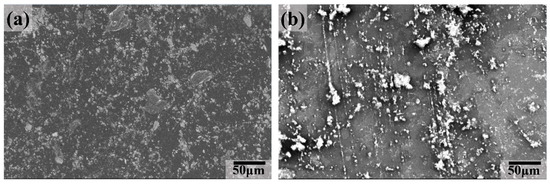 To better understand the wear mechanism of the UHMWPE matrix composites, SEM examinations were performed to analyze the morphology of the worn surface (Figure 9, Figure 10, Figure 11 and Figure 12). Figure 9 shows the morphologies of the worn surface for the UMT composite after being coupled with a GCr15 stainless steel ball at different aging time. At 8 h, tiny furrows with some flaking pits constituted the main feature of the worn surface, indicating that adhesive wear was the main wear mechanism. Large wear debris except for some furrows appeared on the worn surface at 16 and 32 h, indicating that fatigue wear was the main wear mechanism. At 64 h, a smooth tribofilm with some small flaking pits appeared, indicating that the main wear mechanism was tiny abrasive wear.