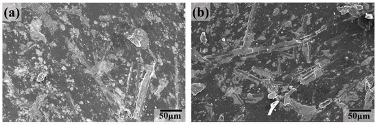Figure 11 illustrates the SEM images of the worn surface for the UCMT5 composite after thermal oxygen aging treatment at different aging times. The main features were similar to those of the UMT composite. Both were characterized by slight grooves and flaking pits; also, the carbon fibers had smeared on the sliding surface, indicating that abrasive wear was the main wear mechanism.