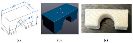 The 3D model of the specimen modelled in the “Solidworks 2018” software. (a) Parameters of the bridge model; (b) 3D model; (c) printed bridge sample.