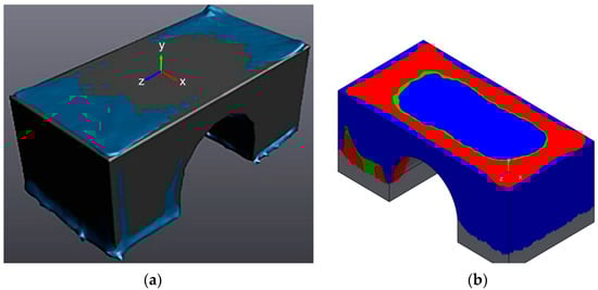 Scanning was carried out with the HandySCAN 3D scanner (Creaform, Houston, TX, USA). The scanning accuracy in automatic and stationary modes is 0.04 mm, and when using markers in the manual scanning mode, it is 0.05 mm + 0.3 mm/m. Figure 3 shows the superimposed models—the 3D model (grey) and a scan of the printed sample model (blue). The superimposition of the 3D model geometry and the scan of the specimen give not only the values of the displacements in coordinates but also the possibility to determine the nature of the stresses. By visualising the overlapping geometry, the stresses can be differentiated into tensile fibres (red) and compressive fibres (compressed). Fibres in a neutral state are shown in green.