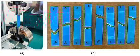 The tensile testing of the samples printed from PLA plastic: (a) the experimental setup; (b) samples after testing.