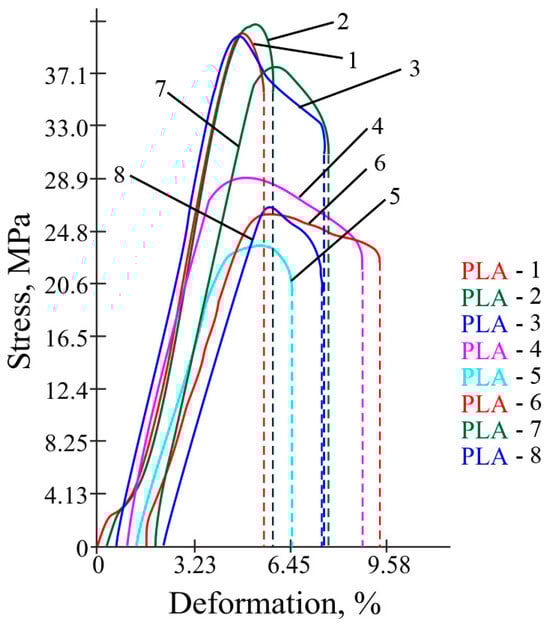 The dependence of stress on deformation for the samples made of PLA plastic at rupture. The curve numbers correspond to the sample numbers from Table 6.