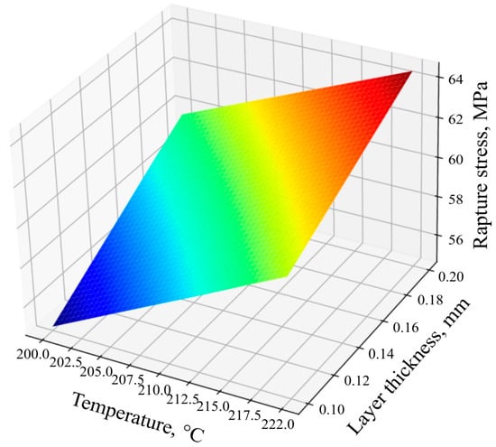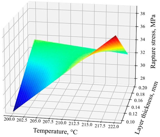 Using Equation (4), the response surface (Figure 7) of the dependence of the ultimate tensile strength of the samples based on technological factors was constructed.