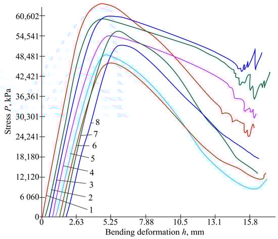 Photos of the experiment and broken samples are shown in Figure 5. Graphs of the stress–strain at rupture are presented in Figure 6.