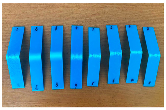 For the experiment on determining the effect of the process parameters on the overall strength of the specimens, eight specimens were printed according to the standard. To carry out the research, test specimens were made according to ISO 527-2:2012 [41] under different combinations of process factors.