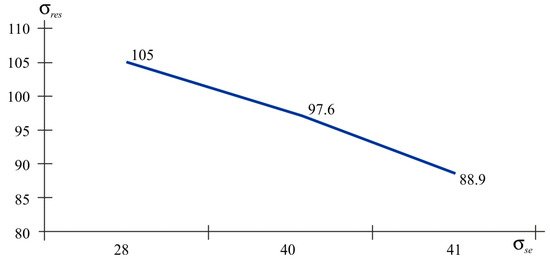 Also in [14], the results of computer modelling of the residual stresses arising during the technological process of printing from ABS plastic are presented. The authors used the Digimat-AM program; computer analysis showed a residual stress level of 76 MPa. Figure 13 shows data on residual stress and stresses at rupture for different technological factors, which are given in the experiment matrix. The difference between the results of the computational experiment and the physical experiment is justified in [3]. Based on a comparison of the tensile strength data in the Digimat-ME program and the results of the tests, the technology was found to provide a 20% reduction in strength indicators.