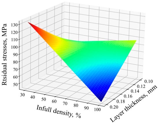 The results of regression analysis using Formula (6) shows that the infill density greatly affects the residual stress, while according to [14], the filling structure does not affect the residual stress. The equation coefficients were determined (Table 14). Figure 14 shows the response surface of the dependence of the residual stresses on the printing technological factors: