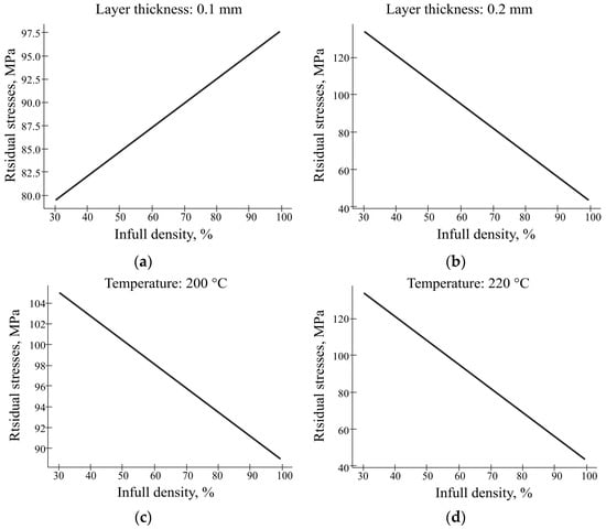 The graphs of residual stresses versus infill density: (a) at a fixed temperature of 200 °C; (b) at a fixed temperature of 220 °C; (c) with a layer thickness of 1 mm; (d) with a layer thickness of 2 mm.