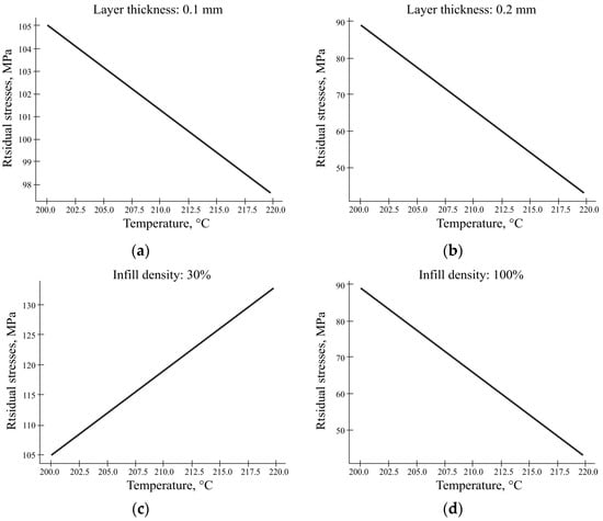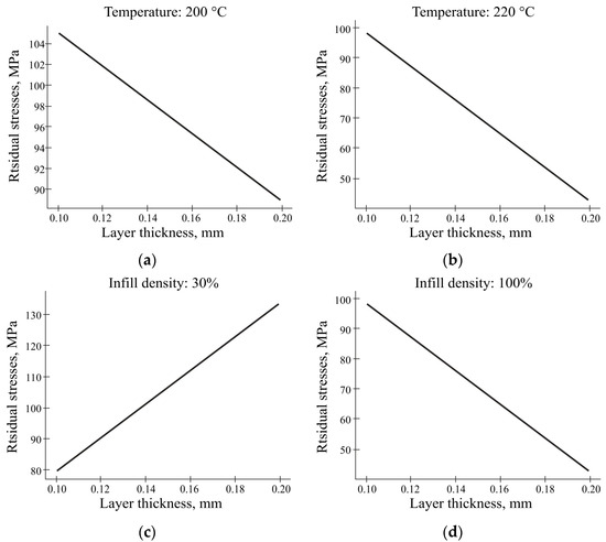 In this study, the relationship between the layer thickness and residual stress was investigated, and the results were consistent with previous results. As shown in Figure 16a,b, it is obvious that the layer thickness has an inverse relationship with the residual stress under the combined influence of temperature factors and the layer thickness. When studying the combined influence of the filling factors and the layer thickness, the opposite picture is observed (Figure 16c,d) in the case of 30% filling. That is, with this filling option, an increase in the layer thickness leads to an increase in the residual stresses. This means that with an increase in the layer thickness, the residual stress decreases. This relationship was also observed in another study [50]. A high level of stress can negatively affect the performance characteristics of the printed parts; even if it does not lead to visible damage, it will affect the geometry of the printed parts. These results suggest that optimizing the layer thickness can be an effective way to reduce the residual stresses and improve the mechanical properties of FDM-printed parts.