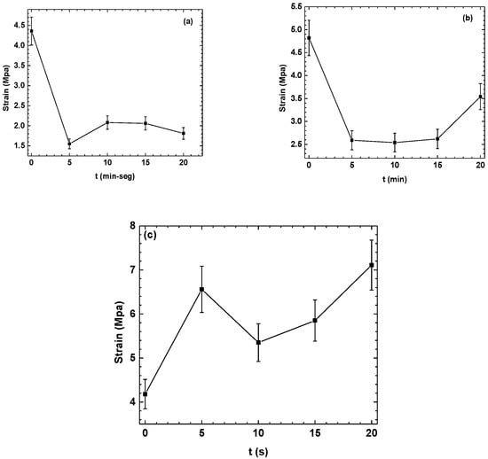 Regarding SS-PHB, it is shown that the treatment of the PHB coatings with APP increases the strain by 55% in the first 5 s of treatment, followed by a decrease of 17% at 10s, and finally, between 10 and 20 s of treatment, an increase in the strain of 69% is observed with respect to the untreated sample. This behavior may be attributed to the surface free energy of the PHB coating, which favors adhesion at the SS-PHB polymer interface, contrary to the increase in free energy in SS.