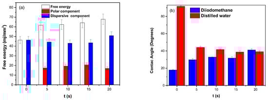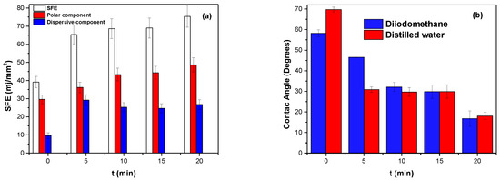 Figure 3a,b, the contact angles and the SFE are shown as a function of the APP treatment time of the PHB coating. The untreated sample has a hydrophobic tendency, evidenced by the contact angle being greater than 90° for distilled water, while diiodomethane has a contact angle of 17.9°. The polar contribution is very low, and the contribution of the dispersive component to the free energy is more significant. This may be due to the many particles that generate induced dipoles produced in the charge distribution of the PHB chain.