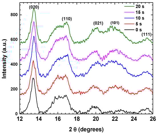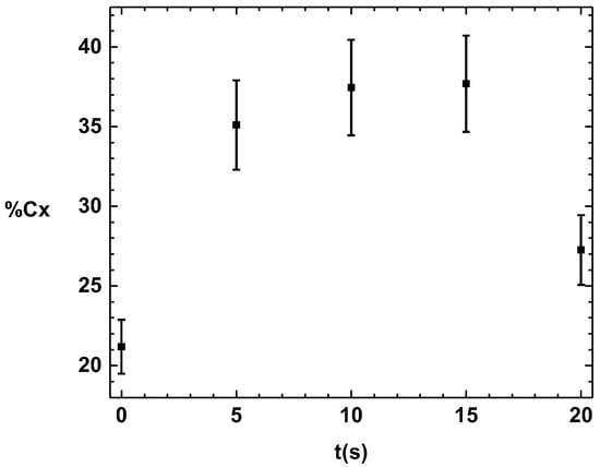 Figure 6 shows the size of the crystals formed at different treatment times. A decrease is observed within the first 5 s of APP treatment due to the intensity of the plasma within the initial seconds. This generates numerous chain breaks and initiates a crystal restructuring process. After 5 s, the crystals begin to grow again. This suggests that after 15 s of APP treatment, the chains begin to lengthen, causing the development of crystals.