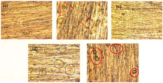Figure 7e), the appearance of small lumps with a darker coloration is shown with red circles. This may indicate that the surface treatment begins to cause damage and possible localized degradation in different areas of the coating due to wear on the surface caused by ions.