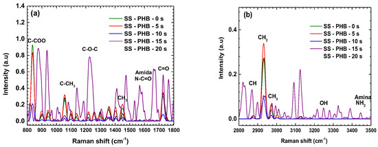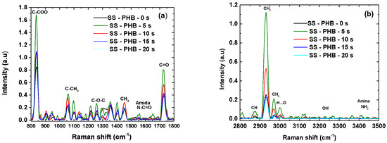 Figure 8 shows the Raman spectra of the SS-PHB coatings for each treatment. The spectra reveal the vibration and rotation modes of the different links comprising the PHB chain. The vibration band of the C=O double bond appears at 1728 cm