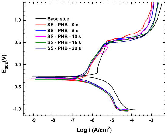 2 at a treatment time of 10 s, higher than that of the sample without PHB coating. This is attributed to the effective barrier behavior of the PHB coating; in other words, it suggests an improved protective barrier capacity against the electrolyte and remarkable corrosion protection of the steel surface against Hanks’ solution. This confirms the results obtained from potentiodynamic polarization tests.